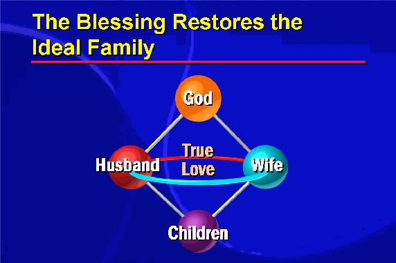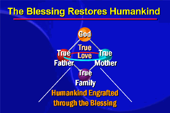The Blessing process is related to rebirth, or the process of salvation. Furthermore, it relates to Reverend Moon's understanding of God's process of restoration of the world and humankind. As has already been explained, originally God's ideal of creation was to be achieved through Adam and Eve's perfection and the creation of an ideal family. When Adam and Eve, as true man and woman, had children, then they would have become true parents.