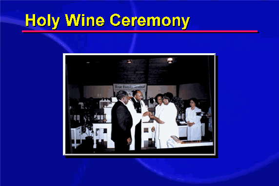 The holy wine, which is made of 21 ingredients representing all things and all levels, is given to the wife first. At the fall, Satan first tempted Eve and then Adam was lost; therefore we first establish the restored woman in a position to find the man.