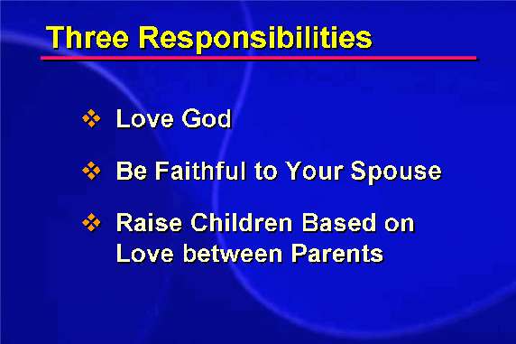The third responsibility is toward the sons and daughters and descendants that will result from this marriage. The most important condition for children, anytime, anywhere, is that children are thinking of their own parents centering on their true, unwavering love for each other. All children expect their parents' relationship to be loving and to be perfectly harmonious. Parents have to share a true love relationship. This is the source of children's character and personality.