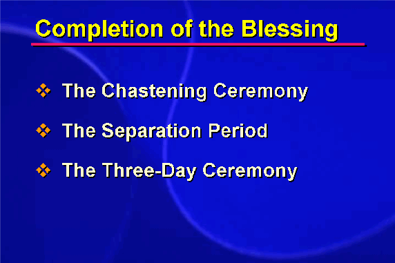 Following the separation period, the couple conducts a Three-Day Ceremony together during which the marriage is consummated. This is the completion of sanctification, in which the couple is restored to the position of true husband and wife with God's blessing to experience true love and create their own family.