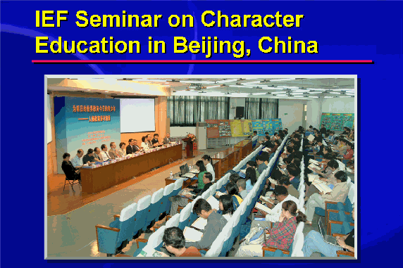 Between 1994 and 2004, in cooperation with Chinese governmental and nongovernmental organizations, the International Educational Foundation (IEF) held more than 260 programs on character education, family values and pure love for youth.