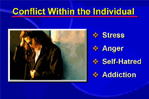 Conflict varies in scope. We want to be at peace within ourselves, but we struggle with contradictory desires and try to deal with our fears, anxieties, resentments, guilt, anger and addictions. We are torn between our ideals and the reality around us.