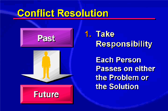 Each one of us stands in the position either to pass on our problems or take steps to resolve them. By not taking responsibility for our behavior, we remain trapped in the cycle of conflict. Of course, in many cases people don't take responsibility because they don't know how. Long-running conflicts may appear insoluble, and those involved can easily feel helpless to do anything. The starting point of conflict resolution is when one party acknowledges their portion of responsibility for the breakdown of harmonious relationships.