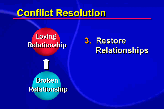 One side must be willing to give up the claim to retaliate -- being willing to forgive even though he or she may feel justified in retaliating. Without a willingness to forgive, no reconciliation is possible. Some interpret forgiveness as a sign of weakness. In reality it is a sign of courage and strength, arising out of sincere concern for the other. Forgiveness liberates one from hatred and resentment. These feelings, though directed at another, hurt oneself far more than they damage the other. Hatred and resentment eat at one's own soul, killing the spirit. The act of forgiveness, on the other hand, frees the self from this poison. It frees the relationship to begin anew and opens the way to love.