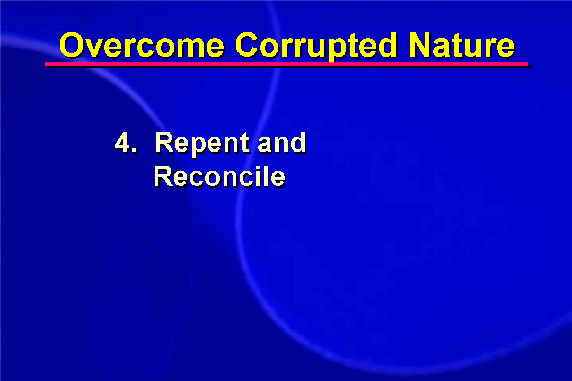 True reconciliation with others requires taking active steps to right the wrongs that were committed that led to a break in the relationship. Having reconciled ourselves with God, we now can recognize how our past actions may have contributed to the conflict and are ready to take responsibility to correct those actions. Specifically we must reverse our wrongful action centered upon the four aspects of our corrupted nature.