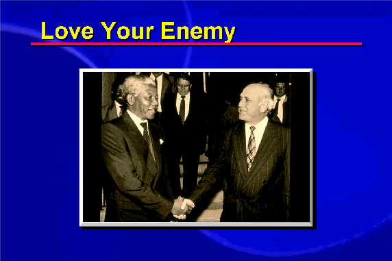 Perhaps the greatest act of love is being able to love your own enemy -- to love those and to give to those who have done some harm to you. The greatest achievement is to transform your enemy into your friend and bring to an end the long-standing pattern of aggression and retaliation. It starts with believing in the other person's essential goodness even though he hurt you. He may seem to be such an evil person but deep down you believe there must be something good in him. Adopting God's parental viewpoint requires being able to look beyond a person's immediate faults and wrongdoing and believing that he can change by living up to his better nature.