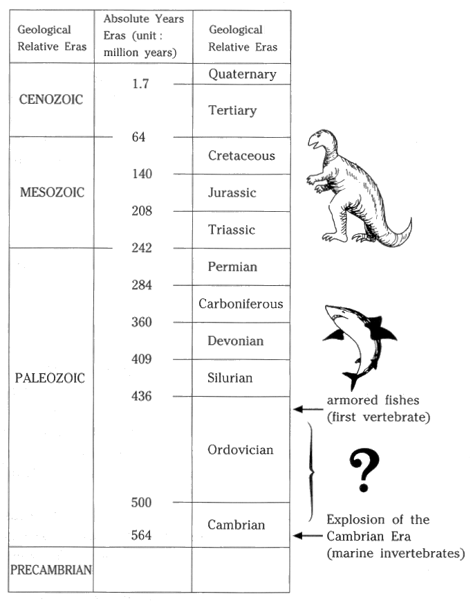 There is a gap of about one hundred million years between the early Cambrian era, from which numerous fossils of sponges, coelenterates (coral), echinoderms (brittle stars), mollusks (snails), and arthropods (trilobites) are found, and the later Ordovician period, from which the fossils of the first animal that really possessed the features of a fish as a vertebrate appeared. No fossils of an intermediate type have been found (Ommaney 1964, 60) (see Fig. 9). No matter how skillfully one might devise hypotheses, it remains extremely difficult to account for this big gap through the theory of evolution.