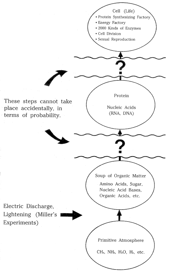 There is an incredible leap in saying that nucleic acids and protein can be formed from the soup of organic matter. As is widely pointed out, can any particular protein and nucleic acids be accidentally generated ? No; they absolutely cannot. Concerning the probability of protein being obtained accidentally, D. T. Gish explains the following