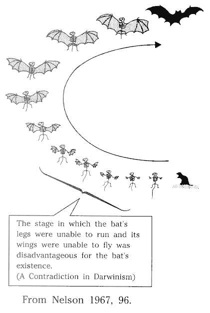 Darwin claimed that the theory of natural selection should be regarded as valid provided the intermediate stages proceeding toward a new complex organ were useful for the living being itself. However, as widely pointed out, the processes through which a new organ was to be formed, namely, the incomplete stage in which the new organ is partly formed, is no more than a disadvantageous stage for that living being's life. For example, a bat is considered to have evolved from a mouse-like animal. But when the front legs of the mouse-like animal were changing into wings, that animal was in an intermediate state in which legs could not be distinguished from wings-and in that state that animal must have been unable either to fly or to run. Therefore, such a state would have been unfit for the animal's existence (see Fig. 11). In that intermediate stage, the animal would not have been selected by nature to survive but would simply have been weeded out. This is a fundamental difficulty in the theory of natural selection.