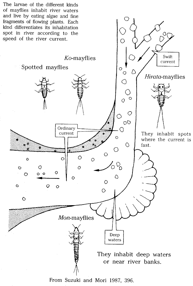 Imanishi has also discovered that the larvae of four kinds of mayflies differentially choose their inhabitation spots according to the difference in speed in river currents; based on that view, he advocated the "theory of differentiation in inhabitation." This theory asserts that the species that are close to one another differentiate their living fields and live in coexistence-which is different from the view that individuals engage in the struggle for existence and only those that are fit for existence survive, as Darwin had stated (see Fig. 12). Imanishi's theory of evolution, which attaches importance to the subjectivity of living beings, can be regarded as belonging to the school of Lamarckism.