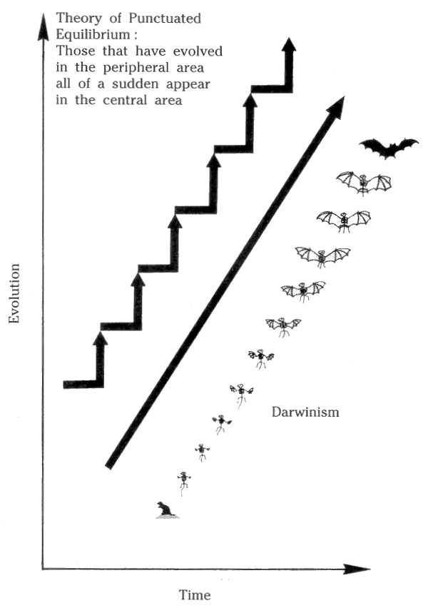 Evolution occurs chiefly in a small group in an isolated, peripheral area because of topographical or climatic obstacles. Yet, the evolution of living beings in the peripheral area proceeds speedily ; therefore, seldom are living beings of an intermediate stage found in the form of fossils; generally speaking, only a group of individuals in the central area that is hard to evolve remains in the record of fossils. Therefore, the record of fossils tends to be static. And after a certain period of time has passed (in which evolution occurs), the descendants that have evolved move from the peripheral area to the central area and multiply. As a result, the fossils of a new species appear, all of a sudden.