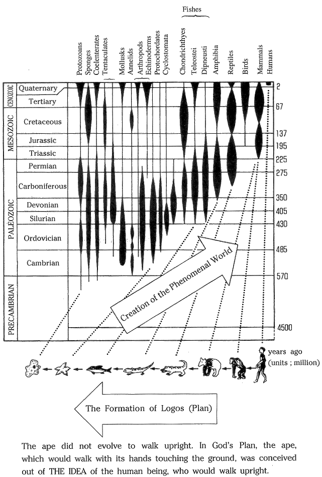 With the marine invertebrates in the Cambrian era as the material, fishes, amphibia, reptiles and mammals were created. (Here, the phrase "with the marine invertebrates as the material," means "with the genes of marine invertebrates as the material.") And it can be seen that, on the basis of the anthropoid among mammals, the ape-man and early man were created; and on the basis of the early man, the human being (the physical aspect of human being) was created.