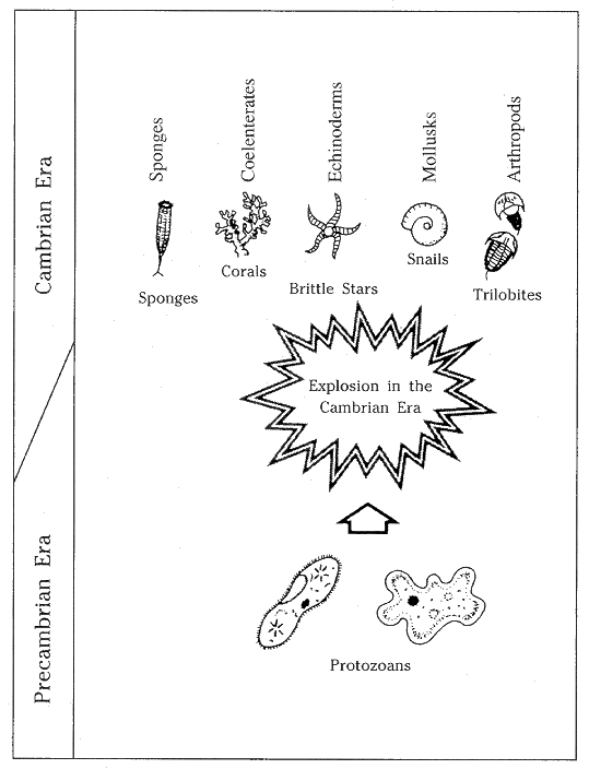 Then, with unicellular organisms as the material, multicellular organisms were formed. About 600 million years ago, at the beginning of the Cambrian era, suddenly multicellular organisms (invertebrates) emerged in great numbers in the oceans. (The Biologists call that phenomenon "the explosion of the Cambrian era," or "the mystery of the Cambrian era") (see Fig. 23). The marine invertebrates that emerged in the Cambrian era can be regarded as having served as the material from which eventually the vertebrates were made. About the explosive phase of the Cambrian era, Gould said the following: