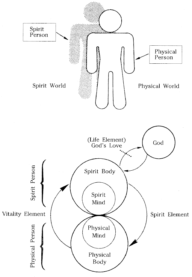 God created all things by investing all His power over a period of several billion years, and it was all for the creation of human beings. And with all things as the material, He created the human being (physical person). Yet, the human being is not merely a physical being. As it is written in the Bible, "the Lord God . . . breathed into his nostrils the breath of life" (Genesis 2:7), and man was given a spirit. The spirit was created with all the elements of the spirit world as the material. The spirit has almost the same appearance as the angel has, who already existed when man came into being. In this way, human beings, Adam and Eve, consisting of spirit (spirit person) and flesh (physical person) were created (see Fig. 24).