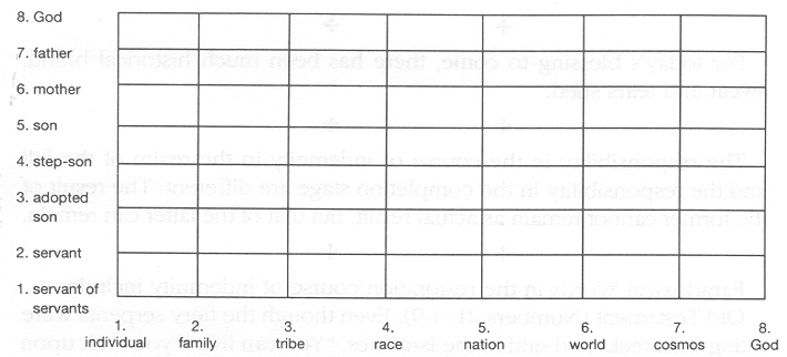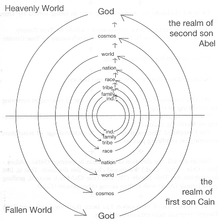 Due to the fall, the direction of dominion is reversed (Satan - Adam -Eve - Cain - Abel - God.) We should change this direction. That is, first to establish the True Family (TF, TM, True Children); second, grafting good people (Abel) with it, then saving other people (Cain).