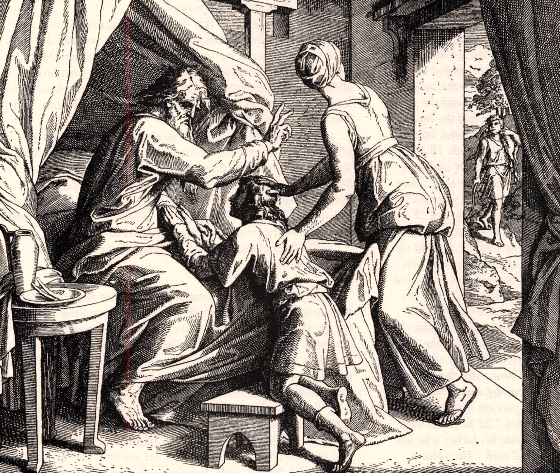 Isaac unknowingly gave his blessing to Jacob, who was pretending to be Esau. When Esau came to Isaac to receive the blessing and discovered what his brother had done, Esau was so angry that he tried to kill Jacob.