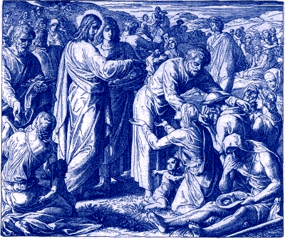 "Bring them here to me," he said. And he directed the people to sit down on the grass. Taking the five loaves and the two fish and looking up to heaven, he gave thanks and broke the loaves. Then he gave them to the disciples, and the disciples gave them to the people. They all ate and were satisfied, and the disciples picked up twelve basketfuls of broken pieces that were left over.
