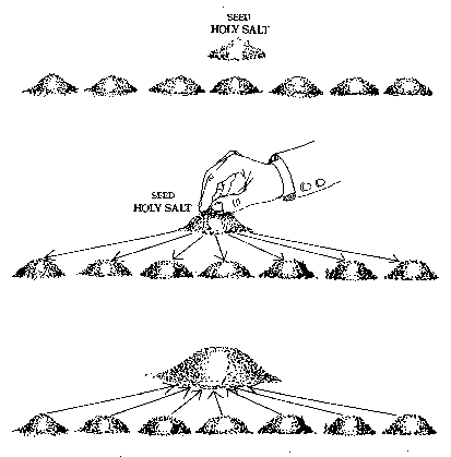 Chapter 8 History According to the lunar calendar, March 16, 1960, is the date of our True Parents' Holy Blessing. This was also the day Father created and used Holy Salt for the first time. He used it to sanctify the church hall before the ceremony, and taught its importance at the meeting he held afterward. After the ceremony, he distributed Holy Salt to those in attendance. He asked those individuals to pass on Holy Salt to members throughout the world. Significance All things of the environment were created for human beings. Adam and Eve needed a pure environment. Due to the fall, everything was lost and came under Satan. However, God's salvation process focused first on restoring humankind. True Parents are the first true couple in all of history. Until the True Parents were completely installed, God could never concentrate on restoring all things. According to the Principle, True Parents are the perfected ideal man and woman and the first God-centered ancestors of humankind. Just as Adam and Eve, they need an ideal environment. After True Parents' Holy Blessing, the environment was not yet ideal. In order to purify the environment and all things, therefore, True Father created Holy Salt. At the meeting after his Blessing, Father gave a portion of Holy Salt to each member present, informing them that when any item was sanctified with Holy Salt, it no longer was part of Satan's dominion but would instead belong to the sovereignty of God. Through our belief in the True Parents and by standing on their foundation of victory over Satan, Holy Salt has the same effect on things when any member of the Unification Church uses it. The "new heaven and new earth" referred to in the Bible actually began at the time of the True Parents' Holy Blessing. When we use Holy Salt, we become participants in building the Kingdom of Heaven on earth. From a providential viewpoint, whenever we use Holy Salt we engage in battle with Satan. We take things from his world and ask God to accept them under His dominion. Members of the Unification Church need to understand that it is a privilege to be able to use Holy Salt. Each member should be conscious of its meaning. Striving to live spiritual lives, each of us is desperate to become free of Satan. Using Holy Salt, in a very basic way, we obtain some of that freedom. Father stressed the importance of Holy Salt in his speech entitled, "The Seven Day Fast," given on October 24, 1974. In our movement we must elevate ourselves to such a standard and in doing that we use Holy Salt to sanctify ourselves. It is not God's intention to have His children use things and eat things stained by satanic control. . . God permitted me to create Holy Salt to sanctify all those things, to bring them into the condition where they are pure enough to be used by His children. . . The value and significance of the Holy Salt is to eradicate or annihilate or exterminate what is satanic, and if you use Holy Salt you are always sanctified. Those who are assembled here may not have known the importance and the value of the Holy Salt. From now on you must feel that you must always have Holy Salt with you. Up to the present you have not had such a notion. Choice of Material Father had to choose a substance which could conditionally purify and sanctify the things of Satan's world and spiritually make them holy even though they would physically look the same. Since salt has traditionally been considered a type of preservative, this was the material he selected. Duration of This Tradition After one nation is restored to heavenly sovereignty, the members of our church who reside in that country will no longer need to use Holy Salt; all things will naturally be sanctified. The use of Holy Salt will continue, even after the sovereignty of one nation is established, until all people and all things of the creation are under God's dominion. Multiplying Holy Salt Members of our church can multiply Holy Salt when necessary. However, it is best for a leader or church elder to multiply Holy Salt for use in the center and divide it among the members. It is also a good practice for spiritual parents to give or to make Holy Salt for their spiritual children when they first join. It is suggested that Holy Salt be multiplied on a table or on paper which has been spread on the floor. Materials Needed to Multiply Holy Salt One must have a quantity of previously sanctified Holy Salt (referred to here as "seed" Holy Salt), even if it is only a few grains, in order to multiply Holy Salt. A new container of regular salt must also be purchased. Preparation. Before buying the salt, set a condition to sanctify it or to separate it from the dominion of Satan. Take a minimum of a few grains of Holy Salt to the store and if it is possible, sprinkle them on the carton to be purchased. Silently and discreetly pray that by the strength of Father's original condition of creating Holy Salt, this new salt will allow all things sanctified with it to conditionally come under God's sovereignty. If the store is crowded or for another reason it is inappropriate or difficult to do this, pray a similar prayer when removing the container of salt from the shelf. Clean the environment to be used to multiply the salt. Procedure Make seven equal piles of new salt as well as a pile with an equal amount of "seed" Holy Salt. (Note: If just a few grains of this "seed" Holy Salt are available, the seven piles should also each consist of only a few grains each. Multiply only this small amount at first and go through the same procedure a second time in order to make a greater quantity.) The "seed" Holy Salt should be in a pile above the new salt. (See diagram 8.1.) The positions shown represent one possible placement [Page 49] of "seed" Holy Salt and new salt but are not absolute. Whether the "seed" Holy Salt or piles of new salt are placed in other positions is arbitrary; the important thing is that the piles of "seed" salt and new salt are eq