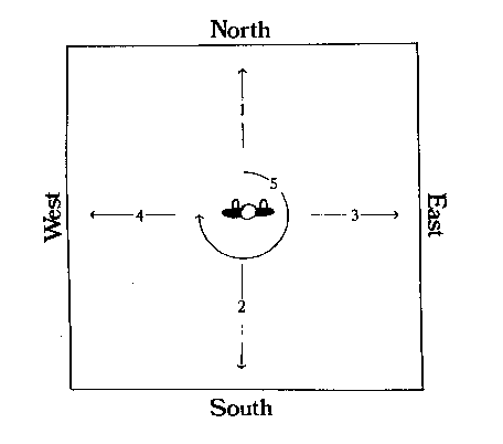 Figure 8-4 8.4. Procedure to sanctify an item with Holy Salt Storing Holy Salt To insure safe storage, Holy Salt can be kept in an airtight container with a lid; this is not mandatory. Beautiful or ornamental jars are often used to store Holy Salt and then used on altars as decorations. It may be a good practice for each center or blessed family to keep a minimum of one container of Holy Salt in a public place (e.g., the kitchen) for use in sanctifying items brought into the center or home. Keep The First Holy Salt Given to You Every member should keep even a small amount of the first Holy Salt ever given to him or her, either at the time he or she joined or first understood its significance. This Holy Salt should be kept separately and not used to sanctify items on a daily basis. If the supply is large enough, small quantities of it could be used as the "seed" Holy Salt when multiplying Holy Salt. Carry Holy Salt With You Father has suggested that it is a good practice to carry a portion of Holy Salt. Since the purpose of carrying Holy Salt is to be able to use it whenever necessary, it is suggested that this not be the Holy Salt originally received. If desired, place Holy Salt to be carried in a very small jar or a plastic bag which can be pressed flat. Use of Holy Salt Purchased Items All items purchased for individual, family, or center purposes -- groceries, clothing, furniture, vehicles, etc., should be purified with Holy Salt when brought into the center or home. On Gifts. Use Holy Salt to sanctify a gift received from a non-member. A member may also wish to use Holy Salt to sanctify a gift received from another member unless he or she specifies that it has already been done. It is not necessary to sanctify with Holy Salt a gift to be given to a non-member. It may be done if desired, but a conditional prayer specifying that it will be given to a person outside the church should also be offered. Belongings When a person moves into the center, his or her possessions should be sanctified with Holy Salt. Each item does not have to be sanctified individually with Holy Salt; it is acceptable to sanctify some possessions representing all. This should be done only once. After moving to another center, belongings do not need to be purified with Holy Salt a second time. From that time, the member should sanctify all purchases with Holy Salt. When associate or home members accept the Principle and understand the significance of Holy Salt, they should begin to sanctify purchases with Holy Salt. Their belongings and home may also be sanctified with Holy Salt in a representative fashion. Rooms or Areas Although the following content explains the method of using Holy Salt to sanctify the main room(s) in a building our movement has purchased, this method may also be followed on occasions when a room or area must be cleansed and purified (e.g., in the case of a low spiritual atmosphere, or in preparation for the Three Day Ceremony or Eight Day Dedication Ceremony). Stand in the center of the room facing north (toward the direction of north) with Holy Salt in your right hand. Follow the same basic prayer included in the section Using Holy Salt: "Prayer," substituting appropriate words where necessary. Toss a small quantity of the salt toward the north wall of the room. Next toss the salt to the south, east and west. From the center of the room spread the Holy Salt in a circle as a condition to cover the entire room (diagram 8.5). Use Holy Salt to sanctify a special area of a room (in which an altar will be placed, for example) in the same manner.