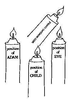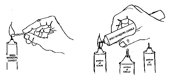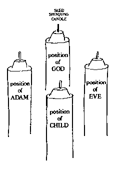 Figure 15-3 15.3. Light the "seed" Shimjung Candle with a Shimjung Match 15.4. "Seed" Shimjung Candle is taken from God's position to light the new candles in the positions of Adam, Eve and Child Light the "seed" Shimjung candle with a Shimjung Match (diagram 15.3) and use the Shimjung Candle to light the other candles (diagram 15.4) in the following manner: Adam, Eve, Child. Afterwards, place the Shimjung Candle in its original position (God's position) (diagram 15.5).