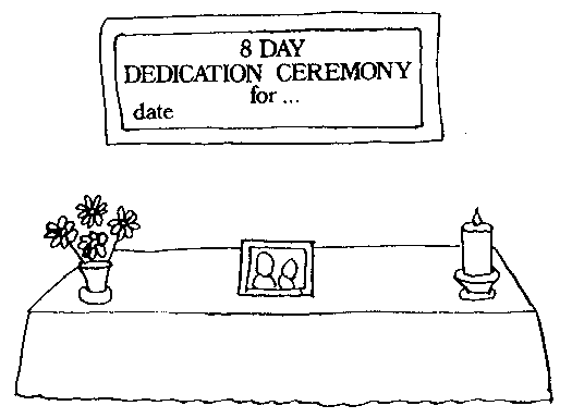 Chapter 20 Significance The blessed couples of this age1 are not yet perfected; even though they conceive physical children, they cannot really embrace those children with true purity. Blessed couples should feel that they are entrusted as the care-givers for Heavenly Father's children, that He uses them to produce heavenly children, and that they assist Him in their nurturing and raising. Blessed children are the ideal of God. Therefore, blessed couples must be extremely grateful that Heavenly Father is able to depend on them to take care of heavenly sons and daughters. Blessed couples express their gratitude during the traditional ceremony of offering the child to God, referred to as the Eight Day Dedication Ceremony. Because Heavenly Father utilizes blessed couples to conceive ideal life, we offer those children to become godly sons or daughters. Through this kind of ceremony, couples should determine to live the standard of the family tradition (the contents of The Pledge of the Families) and also promise to externally and internally take care of the child(ren) God gave them. It is important to understand that the ceremony of child dedication is not concerned with externals, but rather is a truly internal ceremony. The main focus of the ceremony is the couple's gratitude to God. After the national level foundation is restored and ideal families live in that environment, it will no longer be necessary to hold the Eight Day Dedication Ceremony. Time of the Ceremony Blessed couples should hold the child dedication ceremony on the morning (7:00 a.m. is the recommended time) of the eighth day after birth. Regardless of what time during the day or night the baby was born, that day should count as day number one. According to the Principle, the number eight signifies a new start. Medical Complications In the event of a premature birth, in which case the baby must stay in the hospital for several weeks or months. the parents should hold a small prayer service on the morning of the eighth day expressing their intention to hold a dedication ceremony when it becomes possible. In their prayer, the parents ask Heavenly Father for a time extension. When the baby comes back from the hospital, the parents should choose a numerically significant day according to Principle and follow the guidelines and format described below. In special cases (e.g., medical reasons) it is sometimes not possible to hold this ceremony exactly on the eighth day after birth. In such instances, another numerically significant day may be chosen for the ceremony, such as the twelfth or the sixteenth day. However, this is the exception rather than the rule. In such cases, it is best to have the ceremony as soon after birth as possible, and it is advisable not to wait until the twenty-first or fortieth day. Conducting the Ceremony As the parents dedicate their child to God at the Eight Day Dedication Ceremony, it is not appropriate to ask an elder blessed couple to conduct the ceremony. The parents themselves should conduct the entire ceremony. If One Parent Must Be Absent If one of the parents must be absent, do not wait until both are present. Instead, the other parent should conduct the ceremony alone, representing the couple. Attendance of the Ceremony Particularly because the infant is so young, it is not a good idea to invite a large number of people to the Eight Day Dedication Ceremony. It is appropriate to invite members of one's Blessing trinity or a limited number of close friends into the ceremony itself. Couples may wish to invite a number of additional guests for refreshments following the actual dedication prayer ceremony. Grooming and Dress Code Parents should bathe. Personal grooming should receive particular attention. The infant should also be bathed. Husband and wife should dress in their white Holy Robes (refer to chapter 18, Holy Robes, for details). Guests attending the ceremony should not wear Holy Robes. Although it is preferable for the child to wear a ceremonial gown, it is not essential. If one cannot be obtained, it is acceptable to use white or light-colored new clothing. Altar It is best to keep the altar simple and focus on the child and the significance of the occasion. Preparation Purify the area for the ceremony by using Holy Salt (refer to chapter 8, Holy Salt: Uses of Holy Salt "Room or Areas," for procedure). The altar or table should be prepared and placed toward the north. (If this is difficult, please refer to chapter 2, Prayer Rooms and Altars.) See diagram 20.1. Required Articles The couple may decide to place a white cloth (or sheet) on the floor just below the altar, although it is not essential. The items necessary to place on the altar are: a white or light colored cloth (new if possible), a picture of the True Parents, and a minimum of one Birth Candle or one or two Shimjung Candles.