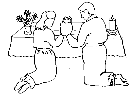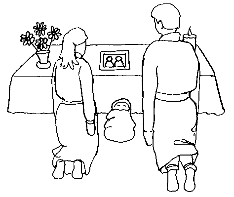 Figure 20-1 20.1. Banner and altar A small vase of fresh flowers is an added touch but not essential. Candles. If the parents choose to place a Shimjung Candle on the altar. it does not have to be a new one. It is not essential to use all seven Birth Candles on this altar. but all may be used if desired. If only one Birth Candle or one Shimjung Candle is used. it should be placed toward the right side as one faces the altar. (Refer to diagram 20. 1.) If two Shimjung Candles are used. they should be placed on either side of the True Parents picture. It is not advised that the seed Birth or Shimjung Candle be used. Seed candles should be reserved principally to multiply new candles. Foods. It is not necessary to place bowls or baskets of fruits. nuts candies. etc.. on the altar. In the early times in Korea. couples generally could not afford to do this. It is acceptable. but it might be suggested that since this is not an actual offering table. refreshments be prepared and served to guests following the ceremony. It is not appropriate to prepare a meal or cake for the Eight Day Dedication Ceremony altar. Memorial Banner. Although it is not a mandatory practice. many parents elect to make a banner (see diagram 20.1 ) and hang it on the wall above the altar. It may be kept and stored with the Birth Candles, if desired. Gifts. On the occasion of the Eight Day Dedication Ceremony, parents should not prepare a gift for the child. This ceremony is basically held for Heavenly Father, not the child. Ceremony Format Internal Preparation From the time the baby is born to the time of the Eight Day Dedication Ceremony, it is advised that the parents prepare internally for the ceremony through strong prayers of gratitude and determination. Format The following step-by-step guidelines are explained below: 1. Parents should face the altar 2. Light the candle(s) 3. Parents should hold the child in their arms 4. Silent prayer 5. Parents should kneel 6. Parents should raise the child (slightly) in offering 7. Place infant in front of altar (head pointing north) 8. Three full bows 9. Recitation of The Pledge of the Families 10. Recitation of My Pledge (if desired) 11. Representative prayer 12. Extinguish candles Both parents should stand facing the altar. Either parent may light the candle(s). Both parents should then hold the child in their arms (diagram 20.2) and offer a (silent) prayer in preparation. At this time, they should cultivate a heart of offering, feeling that their child now belongs to God. Both parents should kneel down and physically raise the child (slightly) in offering before God (diagram 20.3). The infant should then be placed on the floor in front of the altar (the head of the child should be pointing toward the north) (diagram 20.4).