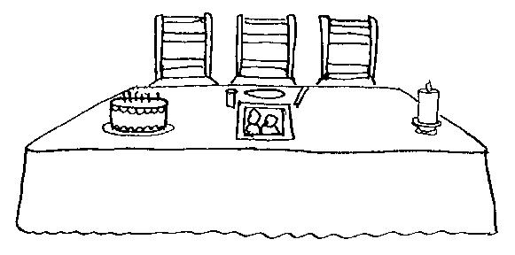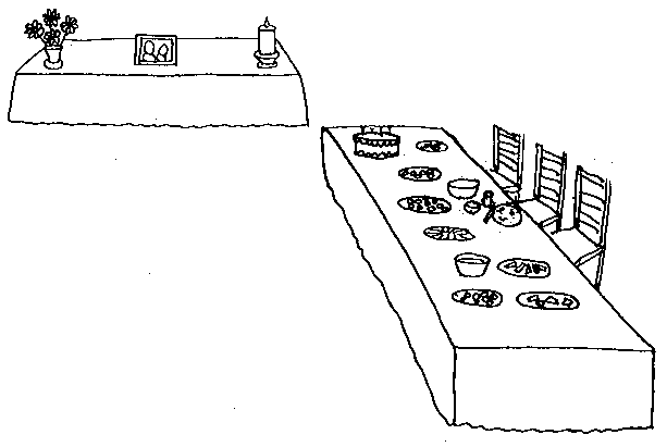 Figure 21-2 21.2. Separate altar and birthday offering table Chairs. Chairs may be placed in back of the altar (diagram 21.1) or the refreshment/offering table (diagram 21.2) for both the parents and birthday child. Food. Food should be prepared for the birthday celebration. For example, a simple meal might be prepared and/or baskets of fruit, nuts, and candies, as well as a birthday cake. This food can be placed on the altar or on a separate table with refreshments for other members of the family and guests. If a birthday cake was prepared, it may be placed on the left side of the altar or on the table with the meal and/or refreshments. Birthday altar dishes. One may wish to purchase special dishes to be used either for the meal or the formations of fruits, nuts, candies, etc. Dishes for this purpose should be kept and used only for birthday celebrations. New dishes need not be purchased for each child. This is optional based on finances, availability, etc. Dress. Both parents and child should wear clean clothes. Color is optional. Wearing Holy Robes on this occasion is a matter of choice. Attendance of the Celebration. When a child is very young, it is best to limit the number of people attending the birthday prayer celebration to members of one's trinity and close friends. One may decide to invite more people to a party or reception with refreshments after (i.e., later in the morning, afternoon, or evening) the prayer celebration, allowing other blessed children near the same age to participate in a celebration, yet not disrupt the prayer service. Time. It is recommended that a birthday prayer celebration be held in the morning. Format. The child and his/her parents should stand facing the altar and offer a silent prayer, offering their gratitude to God (diagram 2 1 .3).