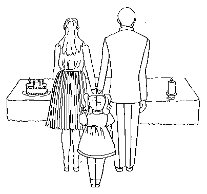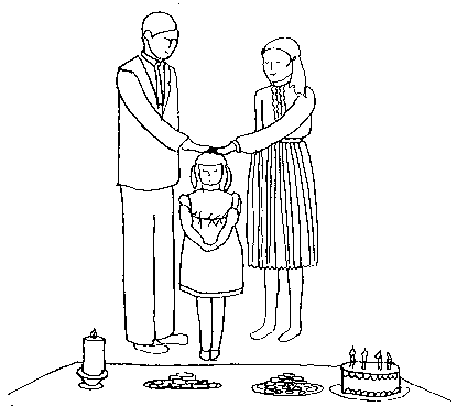 Figure 21-4 21.4. Father places his right hand and mother places her left hand on the child's head ask that You take care of this child for the coming year and that he/she may become a true son/daughter to You. The parents may then sit down on the chairs or cushions (either in front or back) of the altar (according to the method used to set up). The child should do one full bow to his or her parents (who represent True Parents). Both parents may feed the child something from the special food and/ or meal that was prepared. Cake cutting. One may put candles on the cake and have the child make a wish and then blow out the candles. Afterwards, the cake can be cut by the birthday child, but when the child is too young, parents can assist. Pictures. Other members of the family can then join the parents and birthday child, and, if desired, family pictures can be taken. Distribution of food. The cake and/or other foods can be shared with the guests at this time or at a reception held later. Gifts. Following the pattern True Parents have set, it is appropriate for parents to give their child a special birthday gift. Gifts and/or cards can also be given by invited guests. Parents and child should focus on the heart with which it is given, not the cost of the gift. Opening the gifts. Parents should prepare a special area where guests may put gifts. It is perhaps most appropriate to open them after the celebration at a private family gathering. Traditional birthday parties. During this transition era, it may be desirable to hold a traditional birthday celebration inviting church members (and perhaps a later reception), and to have a separate birthday celebration with non- member friends of the children either later the same day or at a more convenient time. Birthday meal. If desired, the immediate family may wish to have a special birthday meal (apart from the birthday reception) Birthday Celebrations of Single Members Single members do not need to hold elaborate celebrations on their physical or spiritual birthdays because birthdays do not have the same value before one receives the Blessing. It is not improper to celebrate, although the celebration should not be extravagant. For three years, Father celebrated his birthday with a fast Members should follow this tradition, if possible. Birthday Celebrations of Blessed Members Spiritual Birthdays After the Blessing, a blessed member need not celebrate his or her spiritual birthday. (See this chapter, Blessing Anniversaries.) Physical Birthdays Significance. Blessed members should celebrate their physical birthdays particularly after starting married life. After receiving the Blessing, a blessed member's life becomes more godly and can more easily be claimed by Heavenly Father. Blessed members, therefore, have more authority from God to commemorate their physical birthdays. Format. With spouse. When possible, these celebrations should be held with one's spouse. This birthday prayer service should be held in private early in the morning and can be conducted along the following guidelines: After a silent prayer of preparation, both offer one full bow toward the altar. They should recite The Pledge of the Families and pray. Individually. One may follow the same basic format if celebrating a birthday alone. Celebration. If the situation permits, it is suggested that a family gathering or outing be planned for the evening. A special meal and/ or birthday cake can be made (perhaps by the children) and shared together. The family might elect to buy a joint gift, as well. Fasting Condition. As already mentioned, True Father celebrated his physical birthday with a fast for three years. This tradition should be followed by all members, if possible. Many members do this before receiving the Blessing; however, if a member did not, it is acceptable to fulfill such a condition after the Blessing. A blessed member may also wish to fast together with his or her spouse if he or she is fulfilling such a condition on his or her physical birthday. Blessing Anniversaries Significance The Blessing day of a blessed member becomes his or her actual "spiritual birthday." Our eternal family life begins at the Blessing ceremony. Be especially conscious of offering thanks to True Parents and Heavenly Father on the advent of each Blessing anniversary. Once again dedicate your couple or family to God and True Parents to become an ideal family. A member should reexamine himself or herself according to the contents of The Pledge of the Families and resolve to uphold its basic principles with even greater determination in the coming year. Celebration Suggestions Prayer Service. In the morning, each blessed couple/member might wish hold a special commemorative prayer service including recitation of The Pledge of the Families. Anniversary Meeting. It is suggested that all blessed couples from the same Blessing living in the same locality gather for an anniversary party/meeting in the evening. Gratitude to True Parents. If it is possible, each group of blessed couples (on the local, state, regional, or national level) should communicate their appreciation on the anniversary of their Blessing by sending a card and/or gift to the True Parents. Through this expression, we educate our children about the meaning of the Blessing, the position of True Parents, and family tradition. Other Celebrations 40-Day, 100-Day Ceremonies Significance. There is no formal tradition of holding 40-day or 100-day ceremonies after the birth of a child. This practice began in our Korean church as an offering of gratitude to God. The numbers 40 and 100 are providentially significant, and parents may choose to hold a special memorial prayer service to thank Heavenly Father for His grace, protection, and care of their child. However, parents choosing to hold these celebrations must remember that they are not to be regarded as "dedication ceremonies." After the national level foundation is restored and ideal famil