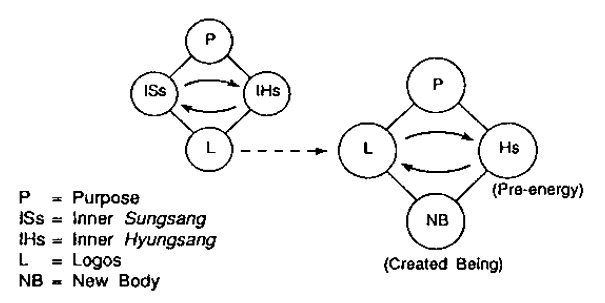 Further explanation of the two-stage structure of creation will now be added. The "new body" that is formed through give-and-receive action between the Inner Sungsang and Inner Hyungsang centering on purpose is the Logos. The Logos is God's Word, that is, God's thinking or plan. More precisely, the Logos is simply God's Sungsang at the time of creation. In other words, the Sungsang (Original Sungsang) of God at the moment of creation becomes the Logos. 20 Next, the Original Sungsang (which, at this stage, is the Logos) engages in give-and-receive action with the Original Hyungsang, which is pre-energy. Through the activity of the Original Sungsang over the Original Hyungsang, God was able to generate energy and elementary particles. He then formed atoms by combining elementary particles; formed molecules by combining atoms; formed cells from atoms and molecules; and formed living organisms by causing the cells to multiply. All of these processes took place based on the Logos.