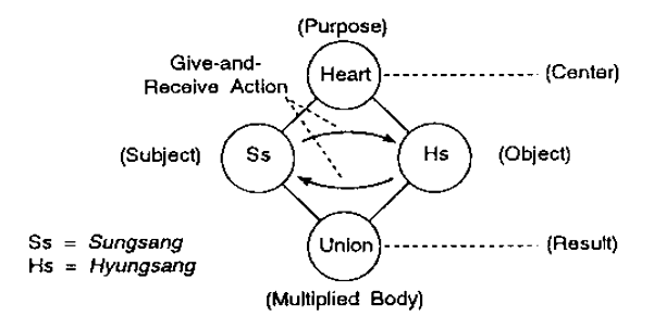 In the Original Image, the Original Sungsang and the Original Hyungsang engage in give-and-receive action, centering either on Heart or purpose, and form a union or a new body. When that takes place, the give-and-receive action can be regarded as occurring in three stages, namely, the stage of Heart (or Purpose), which is the Origin (Chung); the stage of the Original Sungsang and Original Hyungsang, which is the Division (Boan); and the stage of either a united being or a new body, which is the Union (Hap). This is called Chung-Boon-Hap action. The Unification Principle states that "God is the absolute reality, the existing neutral center of the two essentialities; therefore, He is the reality of the number three." 21 This statement is a direct reference to Chung-Boon-Hap action.
