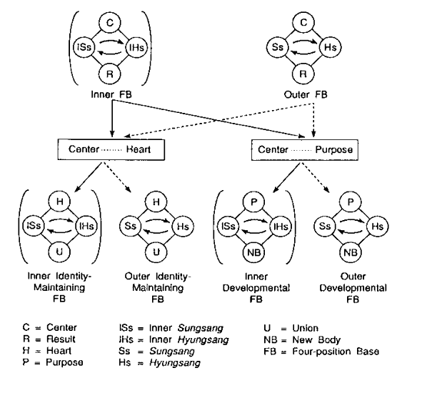 2. The Outer Identity-Maintaining Four-Position Base: This base forms a union, or a harmonized body, through give-and-receive action between God's Original Sungsang and the Original Hyungsang centering on Heart. This constitutes the internal structure of the Original Image and indicates the absoluteness, harmony, and eternal unchangeability of the Original Image, or God's attributes.