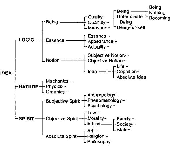 Hegel's logic consists of three branches, namely, the Doctrine of Being, the Doctrine of Essence, and the Doctrine of Notion. These three branches are each subdivided, such that the Doctrine of Being consists of Quality, Quantity, and Measure; the Doctrine of Essence consists of Essence, Appearance, and Actuality; and the Doctrine of Notion consists of Subjective Notion, Objective Notion and the Idea, and these are each, further subdivided. For example, Quality in the Doctrine of Being consists of Being, Determinate Being, and Being-for-Itself, and Being further consists of Being, Nothing, and Becoming.