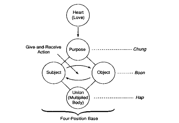 The four-position base in the Original Image is a notion dealing with the structure of God's attributes, which is the structure of four positions consisting of Heart (or purpose) as the center, subject, object, and a union (or a multiplied body). Seen from the viewpoint of time, Heart (or purpose), which is the center, exists first; then, with that as the starting point, the subject and the object enter into give-and-receive action; finally, a union or a multiplied body is formed. Here, Heart, which is the center, stands as Origin (Chung); the subject and the object stand as Division (Boon), in the sense that thy are separated and placed face-to-face with each other; and the union or the multiplied body, namely, a result, stands as Union (Hap). The whole process of this give-and receive action is called Origin-Division-Union Action (Chung-Boon-Hap Action) (Fig. 11-2).