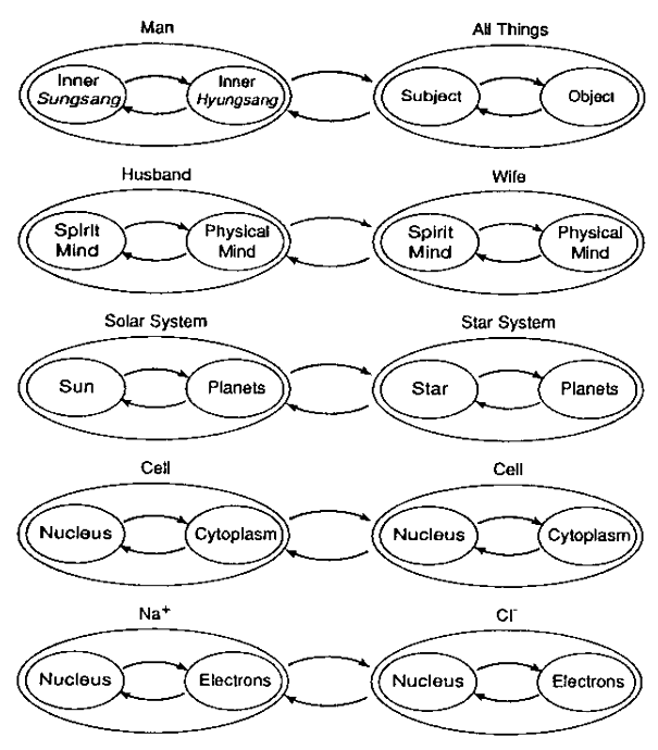 Thinking and conversation are also carried out according to the give-and-receive method. That is to say, when the subjective part in thinking (inner Sungsang), namely, the functions of intellect, emotion, and will, and the objective part (inner Hyungsang), namely, ideas, concepts, laws, mathematical principles, etc., enter into give-and-receive action, human thinking is conducted.