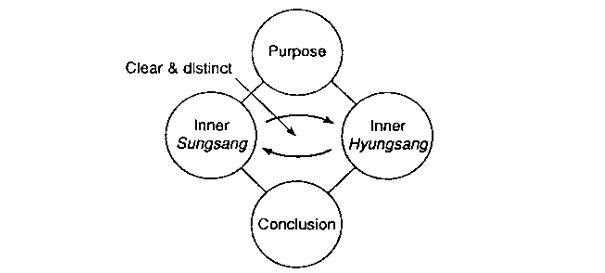 The Idea does not develop by itself through the contradiction within, as Hegel claimed. Thinking is carried out as the inner Sungsang -- namely, the functions of intellect, emotion, and will-act upon the inner Hyungsang (including ideas), forming new ideas. This is called the development of thinking in a spiral form, as was explained in the chapter on Logic.