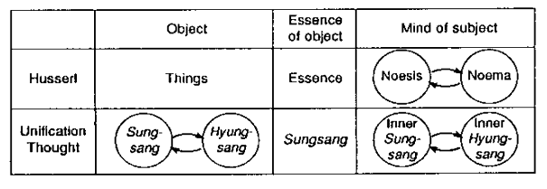 Essence here corresponds to the Sungsang of existing beings. In addition, Husserl claimed that when judgment is suspended and consciousness (pure consciousness) is analyzed, there is a structure of noesis and noema. This, when seen from the perspective of Unification Thought, corresponds to the internal structure of Sungsang (mind), which consists of inner-Sungsang and inner-Hyungsang. A comparison between Husserl's phenomenological method and the viewpoint of Unification Thought would be as in Fig. 11-9.