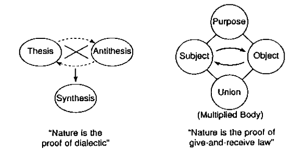 Among the methodologies in the past, none was more influential than the Marxist materialist dialectic. Trying to prove that Marx's dialectic was valid in nature as well, Engels studied natural sciences for eight years. As a result, he concluded that "nature is the proof of dialectics." The errors of the materialistic dialectic are now evident, however. Natural phenomena are, if examined well, not the proof of dialectics, but instead the "proof of the give-and-receive method" (Fig. 11-8).