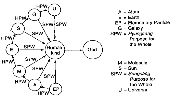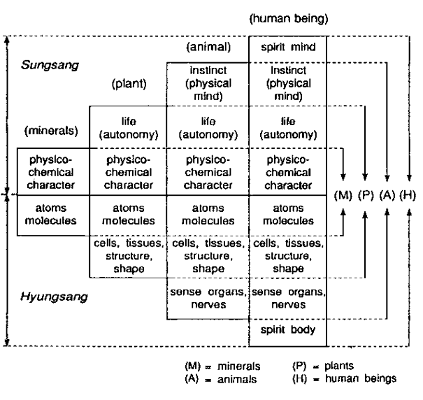 Thus, human beings possess the Sungsangs and Hyungsangs of minerals, plants, and animals; in addition, they possess a Sungsang and Hyungsang of an even higher level. When seen in this way, the human being can be regarded as the integration of all things, or the microcosm of the universe. From the above explanation, it becomes clear that, as the level of existing beings becomes higher from minerals to plants, animals, and human beings -- the Sungsang and Hyungsang become more substantial by layers. This is called "layered structure of Sungsang and Hyungsang in existing beings" and is illustrated in Fig. 2-1.