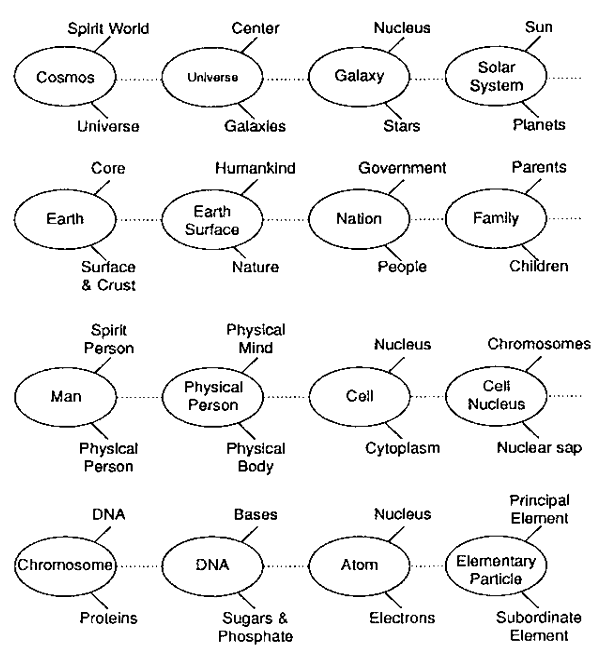 Every existing being contains a correlative relationship of Sungsang and Hyungsang, yang and yin, and principal element (being) and subordinate element (being). This will be explained through a few examples of individual truth bodies on different levels, extending from the largest world (macrocosm) down to the smallest elementary particles (microcosm).