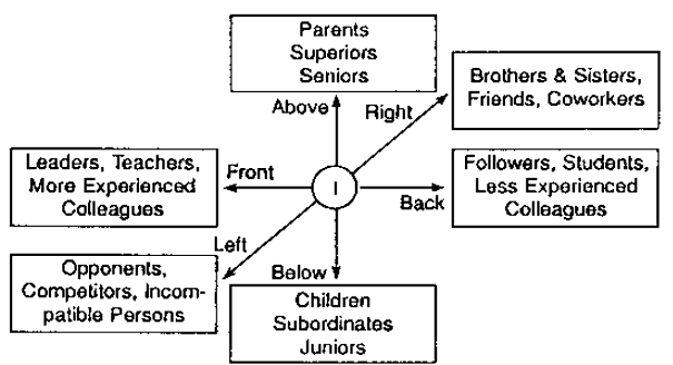 In forming an outer four-position base, the human being enters into give-and-receive actions with other people in six directions, namely, above and below, front and back, and right and left. Taking oneself as the center, above there are one's parents, superiors, and seniors; below there are one's children, subordinates, and juniors; to the front, there are leaders, more experienced colleagues, and teachers; to the back, there are followers, less experienced colleagues, and students; to die right, there are brothers and sisters, friends, and co-workers; and to the left, there are opponents, competitors, and incompatible persons. The original way of life for human beings is to form harmonious relationships in all six directions (Fig. 2-5).