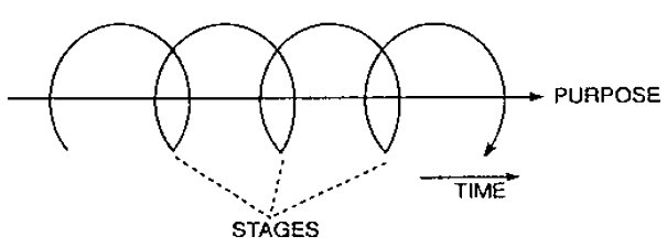 The succession of generations, which is intended for the preservation of the species, is a kind of circular motion, and its characteristic features are that it possesses purposefulness, it grows with time, and it has the nature of proceeding in distinct stages. This is called "spiral motion" (Fig. 2-7). For example, art apple seed lilts the purpose of bearing the apple fruit, which it fulfils through a process that takes a certain period of time. A complete stage (cycle) of growth comes to an end when new seeds are produced within the new fruit.