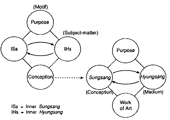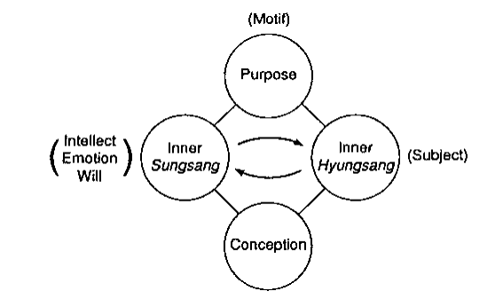 This holds true in the creation of artistic works. As for the formation of the inner four-position base, I have already explained it in terms of requisites for the subject. To repeat, centering on the motif (purpose), the Inner Sungsang (intellect, emotion, and will) and Inner Hyungsang (theme) engage in give-and-receive action and produce a conception. That is the formation of the inner four-position base. Next, an outer four-position base is formed through give-and-receive action, centering on the motif (purpose), between the Sungsang (conception) and the Hyungsang (materials). In the formation of the outer four-position base, special techniques or abilities may be required. This is called the technique of creation.