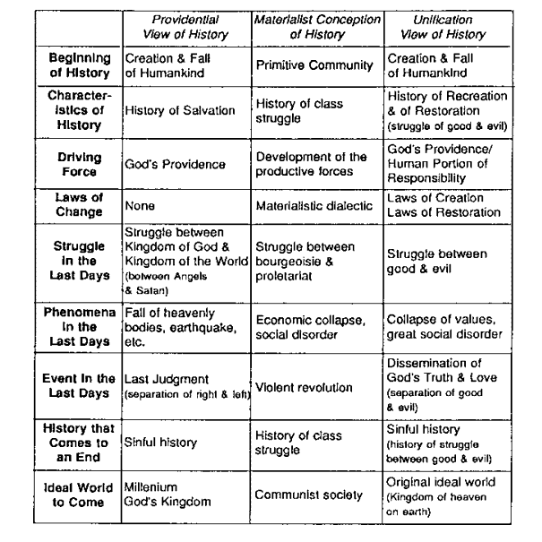 The providential view regards history as history of salvation by God. The materialist view regards history as history of class struggle. In contrast, the Unification view grasps history from the two aspects of re-creation and restoration.