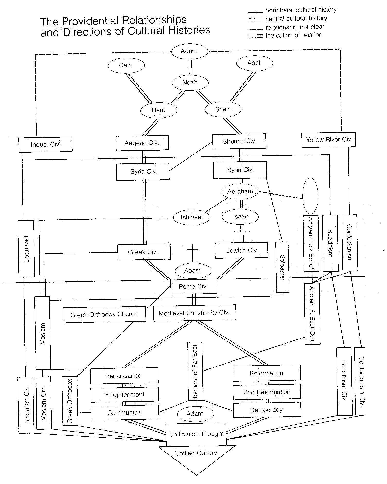 VIII: Theory Of History 76. What is the weak point of the view of history by traditional Christianity? Also, what have been the consequences of its weak points? (1) It is reasonable that the view of history by traditional Christianity asserts the beginning of history and the last days; the ending of history. This view however, has been unable to explain about the concrete contents of the beginning and ending of history (the real content of the fall of man and the advent of the Messiah). (2) The traditional Christian view states that historical development is caused by God's providence, but is unable to reveal the concrete laws of God's providence. Accordingly it has fallen into mysticism, which is liable to give the impression of superstition to the analytical and logical modern man. (3) Therefore, the view has been placed at a disadvantage when confronted with other ideologies. Especially in logical confrontation with communism, it has always been defeated. Consequently, a great number of intellectual people have been lured to believe in communism. 77. What are the basic laws of history, through which God's providence has been working? God's providence has worked through both the laws of creation and the laws of restoration. The following are the kinds of basic laws. (1) Laws of creation a. The law of relativity b. The law of give-and-take c. The law of dominion of the center d. The law of shared responsibility e. The law of completion (development) through three stages f. The law of the period of the number six. (2) Laws of Restoration a. The law of indemnity b. The law of separation c. The law of restoration of the number four d. The law of conditional dispensations e. The law of falsity preceding the truth f. The law of the horizontal reappearance of the vertical g. The law of the parallel dispensation 78. What are the basic laws of historical development? (1) The give-and-take law In historical development, one of the most basic factors is the law of give-and-take action. It is not because of struggle, but because of this harmonious give-and-take action between the subject (leader or responsible person) and the object (ordinary people or followers) that society and technology have made such remarkable progress. (2) The law of repulsion Human history is the history of restoration. Therefore the development of history must take a direction toward restoration, whenever the development is brought about. The law which causes the direction to undergo change toward restoration is the law of repulsion. Originally the phenomenon of repulsion is the phenomenon which naturally occurs between two subjects or between two objects. In the natural world this law of repulsion helps to strengthen the give-and-take action. In fallen society, however, God has set up the subject on God's side who has struggled with the subject on Satan's side, based on the law of separation. And through the victory of God's side, God has restored history toward the direction of goodness. (But, except for the struggles significant to God's providence, we cannot always regard the struggle as repulsion based on the law of separation). (3) The law of dominion of will-action In historical development, the give-and-take action between the subject and the object has existed not only between the leader (responsible person) and ordinary people (followers), but also between the will (reason, desire) of man and economic property, that is, materials. This is the world of economics or industry. Man's desire (will), which seeks after a more comfortable life, has brought about development of economy (industry), by handling creative (for example, land, raw materials, machines) and consuming property (daily necessities). In other words, in history, the law of give-and-take action has been applied between the will of man and economic property. In this case the factor of the subject has been "will," that is, "will" is always far more active than material, so we call this side of the give-and-take action, the law of dominion of will-action. Communist theory asserts that production forces, which are material, have brought about the development of history. This assertion is, however, completely wrong. The fact is that the give-and-take action between will and matter, that is, the will-action, has brought about the development of history. 79. Draw a chart which shows the providential relationships and directions of central cultural history and peripheral cultural history. |