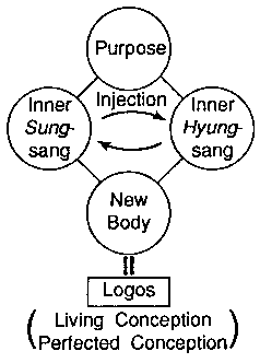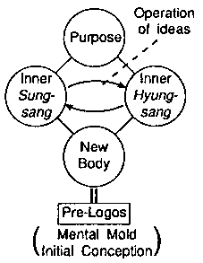 Fig N-a Next, in the advanced stage of inner give-and-receive action, the faculties of intellect, emotion, and will, centering on Heart, are injected into the Inner Hyungsang. In this case, the Inner Hyungsang is the mental mold , or initial conception, which was formed through the beginning stage of inner give-and-receive action. Through the advanced stage of give-and-receive action, a Logos is formed as a living conception, or a perfected conception. Following the two stages of inner give-and-receive actions mentioned above, outer give-and-receive action begins to take place between the Original Sungsang and the Original Hyungsang. At this stage, the Sungsang is the united being of intellect, emotion, and will, and it contains the Logos; the Hyungsang is pre-energy. Through the give-and-receive action between the Original Sungsang and Original Hyungsang, pre-energy penetrates into the mold of the perfected conception (i.e., Logos), and through this process, created beings are produced. 21. Divine Principle, p. 53. 22. Hirschberger states, "People like to call this pan-logism, and in relation to this pan-logism, they have regarded Hegel as the advocate of the mystical, pantheistic theory that all is one. Philosophers of a scholasticist inclination have generally uniformly regarded Hegel as a philosopher of a pantheistic identity" (Hirschberger, Geschichle der Philosophie, Freiburg, Verlag Herder, 1984, 11., p. 419).