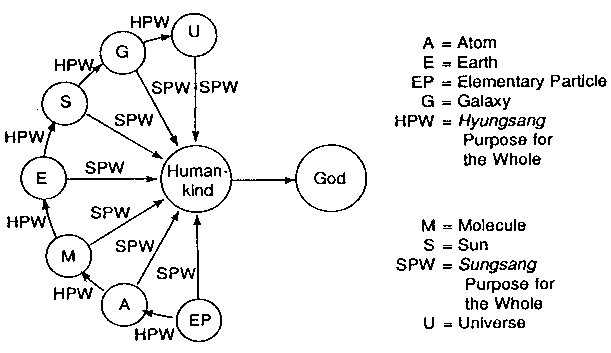 IV. The Connected Body The individual truth body contains within itself the correlative elements of subject and object centered on purpose, and these two elements are united through give-and-receive action. In addition to that, an individual truth body can also form a relationship of subject and object with another individual truth body, whereby the two can engage in give-and-receive action. When placed in such a relationship, the individual truth body is called a "connected body." A. The Connected Body and the Dual Purpose of Existing Being From the perspective of purpose, a connected body refers to an existing being with a dual purpose, namely, the "purpose for the individual" and the "purpose for the whole." The purpose for the individual is to maintain and develop its own existence as an individual being. The purpose for the whole is to contribute to the existence and the development of die whole. For examples of dual purpose, let us consider the system of the created world, which extends from the level of elementary particles all the way to the level of the universe itself. Elementary particles exist for the purpose of forming atoms, but at the same time, they maintain their own existence as elementary particles. Atoms exist for the purpose of forming molecules, but at the same time, they maintain their own existence as atoms. Molecules exist for the purpose of forming cells, but at the same time they maintain their own existence as molecules. Cells exist for the purpose of forming tissues and organs, but at the same time they maintain their own existence as cells. Atoms and molecules also exist for the purpose of forming minerals, which form all material bodies, such as the earth. The earth exists for the purpose of forming the Solar system, but at the same time, it maintains its own existence as the earth. The Solar system exists for the purpose of forming the galaxy, but at the same time, it maintains its own existence as the solar system. The galaxy exists for the purpose of forming the universe, but at the same time, it maintains its own existence as the galaxy. Furthermore, the universe exists for the sake of humankind, but at the same time, it maintains its own existence as the universe. In this way, all created beings have a dual purpose, namely, the purpose for the whole and the purpose for the individual. Among the various purposes for the whole, which one is the highest purpose? In the created world, the highest purpose is to exist for the sake of human beings. For human beings, the highest purpose is to exist for the sake of God. Thus, all created beings, from elementary particles to the universe and to human beings, exist as connected bodies with dual purpose. Within the purpose for the whole, there are two types of purposes, namely the "Sungsang purpose for the whole" and the "Hyungsang purpose of the whole." For example, the earth has the purpose of forming the solar system, and at the same time it has the purpose of serving as the dwelling place for human beings. In the case of electrons, they revolve around the atomic nucleus in order to form an atom, and also they do so for human beings by forming all things, which exist for the sake of human beings, since things are objects of human dominion. Thus, each level of created beings from elementary particles to the universe itself -- exists both for the purpose of being part of a higher level being and, at the same time, for the sake of humankind. The former purpose is called the "Hyungsang purpose for the whole," and the latter purpose is called the "Sungsang purpose for the whole" (Fig. 2-4).