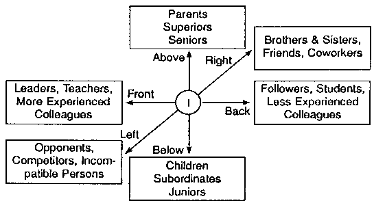 Fig. 2-4: The System of Purposes for the Whole in Created Beings B. The Connected Body and the Original Image We saw previously that the Original Image exists in a two-stage structure, namely, the Inner Four-Position Base and the Outer Four-Position Base. In the created world, all beings exist in a similar two-stage structure: they maintain inner four-position bases as individual truth bodies while forming outer four-position bases with other individual truth bodies. In human beings, an inner four-position base is formed through give-and-receive action between the spirit mind and the physical mind, and an outer four-position base is formed through give-and-receive action with another person. Human beings must harmoniously maintain both their inner and their outer four position bases. In other words, the proper way of life is to live a life of values (forming inner four-position bases) and to love others (forming outer four-position bases). In forming an outer four-position base, the human being enters into give-and-receive actions with other people in six directions, namely, above and below, front and back, and right and left. Taking oneself as the center, above there are one's parents, superiors, and seniors; below there are one's children, subordinates, and juniors; to the front, there are leaders, more experienced colleagues, and teachers; to the back, there are followers, less experienced colleagues, and students; to die right, there are brothers and sisters, friends, and coworkers; and to the left, there are opponents, competitors, and incompatible persons. The original way of life for human beings is to form harmonious relationships in all six directions (Fig. 2-5).