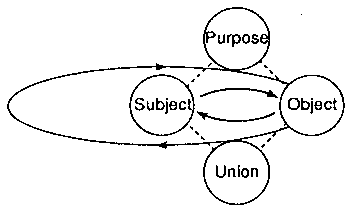 V. The Connected Body The mode of existence of existing beings refers to the manner in which all created beings exist. In a nutshell, no created being can exist unless it engages in motion; hence, motion is the mode of existence of all created beings. God, who is the Absolute Being, (toes not engage in motion; therefore, it is impossible to think of a mode of existence in the Original Image. Created beings, however, exist in time and space, and so they have a mode of existence, which is motion. A. Circular Motion When, in the created world, two elements in the relationship of subject and object engage in give-and-receive action, centering on purpose, then the result is that both union and motion appear simultaneously. Purpose itself is not an existing being, and the union is merely a state that arises as a result of the give-and-receive action; therefore, the participants in the motion of the give-and-receive action are the two beings in the roles of subject and object. To be precise, the center of the give-and-receive action lies not in some intermediary position between the subject and the object, but within the subject itself. Accordingly, the motion of this give-and-receive action cannot but become a subject-centered circular motion (Fig. 2-6). In an atom, for instance, electrons revolve around the nucleus; and likewise in the solar system, planets revolve around the sun.
