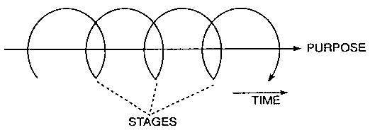 Fig. 2-7. Spiral Motion Let us consider now the significance of living things making spiral motion. The physical person of a human being is not an eternal being. When the spirit person becomes perfected, the physical dies, and the mature spirit person goes on to live eternally in the spirit world. (Yet, because of the Human Fall people have died physically with their spirit persons still unperfected.) The realization of the purpose of creation means that human beings grow, perfect their individuality, get married, bear children, and have dominion over all things-in other words, they fulfill the three great blessings (Gen. 1:28). Accordingly, human beings have been created to live during a certain period of time on earth and to multiply through the succession of generations. Therefore, all living things, which exist as objects to human beings, preserve their species through the succession of generations, and multiply in order to become the object of dominion by human beings on earth. 2. Transformed Circular Motion Fundamentally, an individual truth body exists by engaging in circular motion. However, due to the particular requirements of the whole purpose at the time when individual truth bodies exist as connected bodies, the circular motion cannot but be transformed. In such cases, circular motion becomes transformed circular motion. There are two kinds of transformed circular motion, namely, motion with a fixed nature, and motion with an alternating nature. a) Motion with a Fixed Nature The atoms forming a being are firmly connected with one another, and each atom maintains a fixed position. In the case of the earth, for instance, if the numerous atoms forming it were to move about randomly, then the earth would revert to a gaseous state, and human beings would not be able to live on it. If the earth is to be a dwelling place for human beings, the atoms that constitute it must be fixedly united to form a solid ground. Therefore, the atoms forming the earth perform transformed circular motion whereby they maintain fixed positions in order to form the dwelling place for human beings. Similarly, the cells forming the tissues of living beings are united with one another. For example, the cells forming the heart of an animal are fixedly united with one another, which enables the heart to contract and expand to perform its function. If the heart cells were to move about independently, the heart would not be able to perform its function. Plants remain stationary, with their roots firmly set under the ground. They remain stationary so that human beings can watch their blossoms and harvest their fruits. These are examples of "motion with a fixed nature." b) Motion within an Alternating Nature in animals, instead of cells making circular motion, the blood and the lymph circulate in the body, connecting the cells, and thereby having the same effect as if the cells themselves were performing circular motion. In plants, also, water and minerals absorbed by the roots circulate throughout the body of the plant through the xylem vessels and tracheids, and the food which has been manufactured in the leaves, through phloem tubes (sieve tubes), thus connecting the cells. The result of this is the same effect as if the cells themselves were making circular motion. In the earth, also, there are the convection currents in the mantle, the movement of the plates (called tectonics), and so on, which manifest the effects of circular motion. The give-and-receive actions in human economic life consist of give-and-receive actions between entrepreneurs and enterprises, between enterprises and enterprises, between enterprises and consumers, and so forth, in which the circulation of money plays the role of circular motion. Those are some examples of "motion with an alternating nature." 3. Spiritual Circular Motion (Sungsang Circular Motion) The give-and-receive action between the spirit mind and the physical mind in human beings is not a physical kind of circular motion, but rather a spiritual kind of circular motion in the sense that the physical mind responds to the desires of the spirit mind. Accordingly, this is spiritual circular motion, or circular motion on the Sungsang level. Also, in the sense that the object behaves as the subject desires, the harmonious give-and-receive action between one person and another in the family or society is circular motion on the Sungsang level, or spiritual circular motion. For example, if parents love their children and instruct them well, the children will come to obey their parents well. This, also, falls into the category of spiritual circular motion. D. A Critique of Materialistic Dialectic 1. On Development Living beings are endowed with life. Life refers to the autonomy and dominion of the Principle, or the conscious energy latent in living beings. The growth of living beings is based on the autonomy and dominion of the Principle, and it is the motion of life itself performed by the unity of consciousness and energy latent in living things. Autonomy is the ability to direct one's own motion without being forced by other beings. The earth revolves around the sun, and it does so by following a law in a merely mechanical manner. Living things, however, do not just follow laws mechanically. They are able to control themselves as they grow and as they cope with various kinds of situations in their environment. This is the meaning of "autonomy of the Principle." On the other hand, "dominion of the Principle" refers to the function of exerting influence on the surroundings. 10 For example, when a seed is sown, a sprout emerges, and leaves come out. At the same time, plants have an influence on their surroundings. Life, then, when viewed from the aspect of growth, is autonomy, and when viewed from the aspect of influencing its surroundings, is dominion. This kind of growth of living things is a developmental motion. Development has a definite purpose and direction. Purpose and di