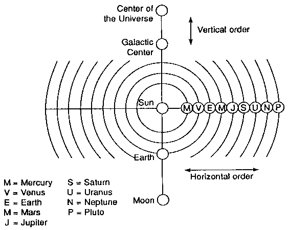 VI. The Position of Existence Every individual body has its own place for existence. The place that a being possesses is called "position of existence" in Unification Thought. When a being's position of existence is different from that of another, and the two beings are in the relationship of subject and object (that is, in the relationship of exerting dominion and receiving dominion), give-and-receive action can take place between the two. As a connected body, a being is simultaneously both in the position of an object and in the position of a subject. As a result, numerous beings become connected to form a system of positions. This is what is meant by order, or an orderly system. Such a system of positions of subject and object is simply a reflection of the positions of subject and object in the Original Image, which are projected onto the created world. There are numerous stars in the universe, which engage in give-and-receive actions from their different positions, forming ;in orderly system and a vast organic body. The order of the universe is of two kinds, namely, vertical and horizontal. The vertical order of the universe is as follows: The moon (a satellite) and the earth (a planet) engage in give-and-receive action, with the earth as the subject and the moon as the object. Next, the earth engages in give-and-receive action with the sun (a star), forming a part of the solar system. Here the earth is the object, and the sun is the subject. Next, the sun engages in give-and-receive action with the galactic center, and together with many other stars, forms the galaxy. Here the sun is the object, and the galactic center is the subject. Furthermore, the galaxy, in unity with many other galaxies, engages in give-and-receive action with the center of the universe, forming the universe. In this case, the galaxy is the object, and the center of the universe is the subject. This line-running from satellite to planet, star, and galactic center, all the way to the center of the universe is the vertical order of the universe. Let us now consider the horizontal order of the universe. If we look at the nine planets of the solar system, we can see that they form an orderly, horizontal arrangement of Mercury, Venus, Earth, Mars, Jupiter, Saturn, Uranus, Neptune, and Pluto. This planetary system, centering on the Sun, is an example of horizontal order in the universe. The vertical order and the horizontal order of the universe are illustrated in Fig. 2-8.